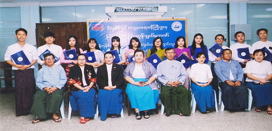 ရန်ကုန်စီးပွားရေးတက္ကသိုလ်မှ ကျောင်းသား၊ ကျောင်းသူများ၏လုပ်ငန်းခွင် လက်တွေ့လေ့လာရေး (Internship) သင်တန်းဆင်းပွဲ အခမ်းအနားကို မြန်မာ့နိုင်ငံခြား ကုန်သွယ်မှုဘဏ်တွင် ပြုလုပ်စဉ်။